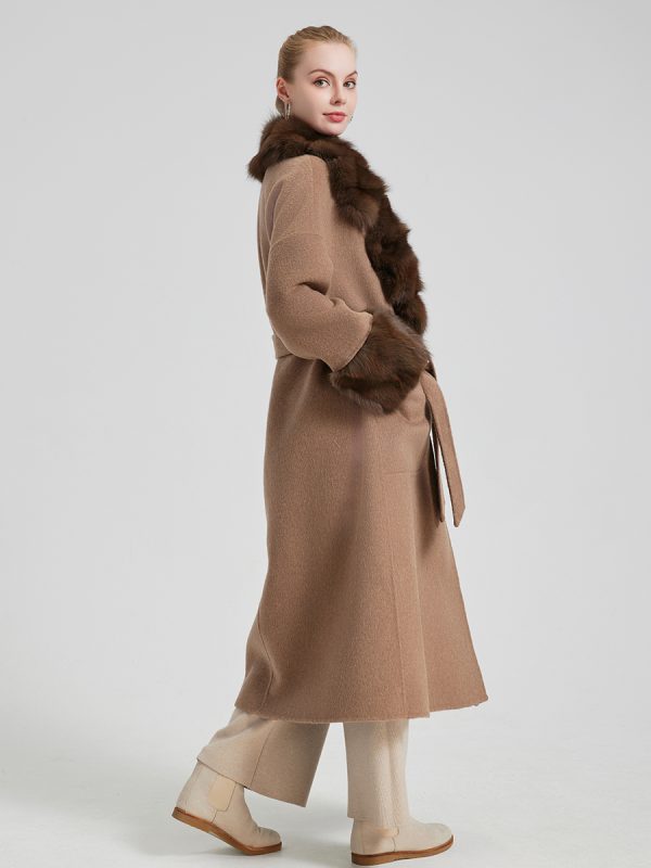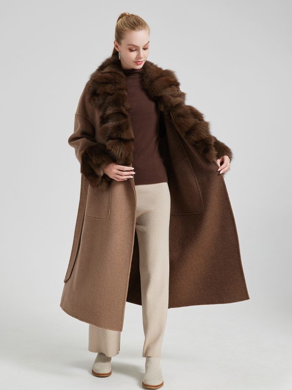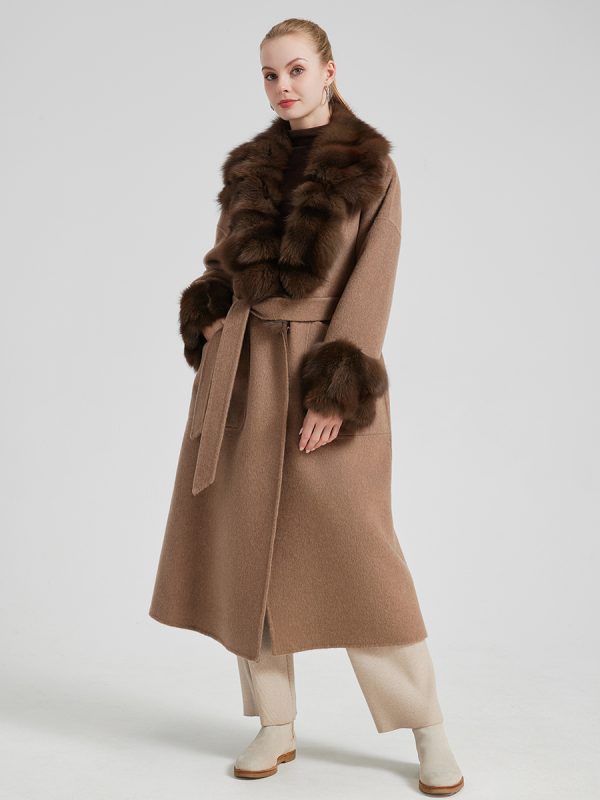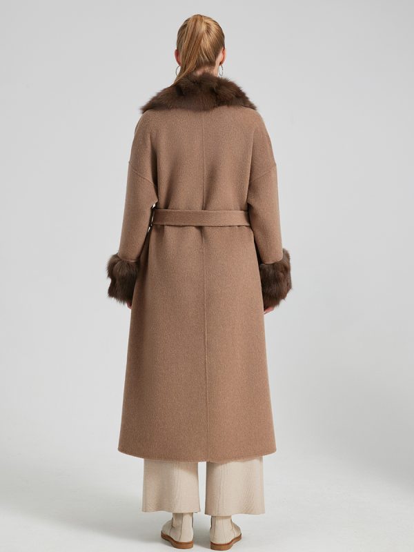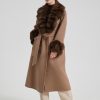 Abrigo largo de cashmere con cuello y puños de fox de alta calidad.