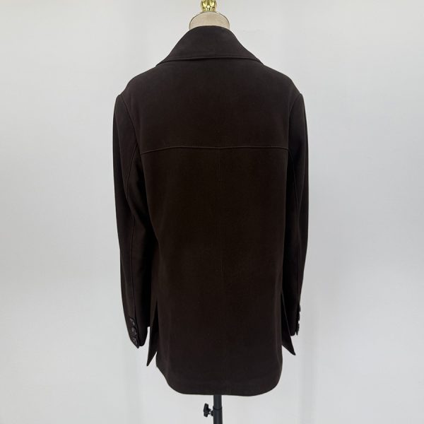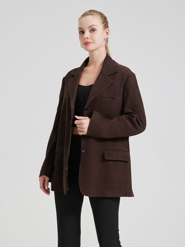 Saco de gamuza de corte clásico con solapa, botones frontales y bolsillos discretos.